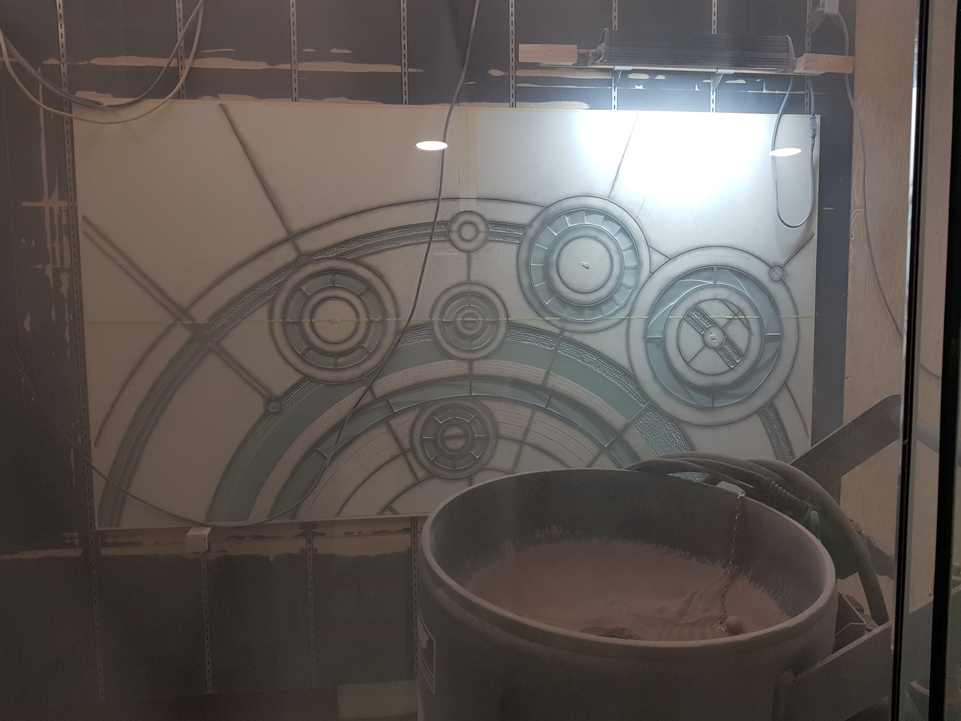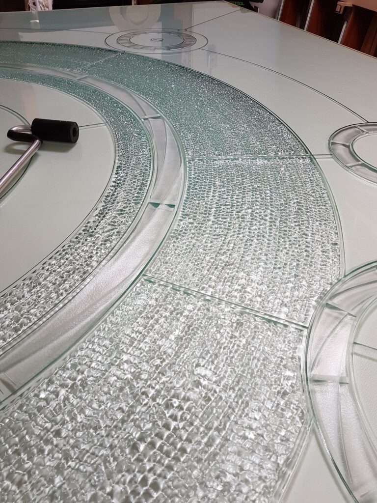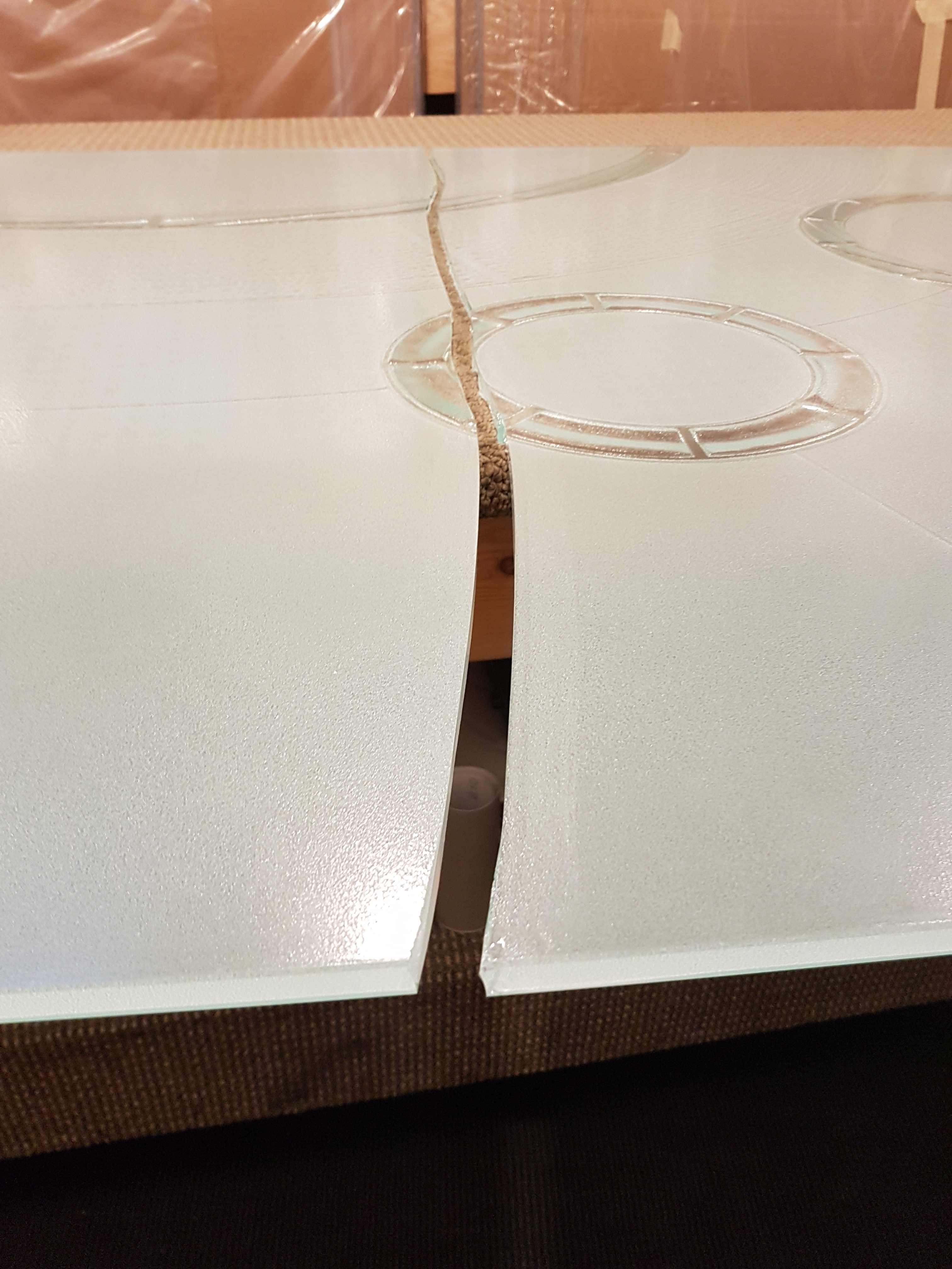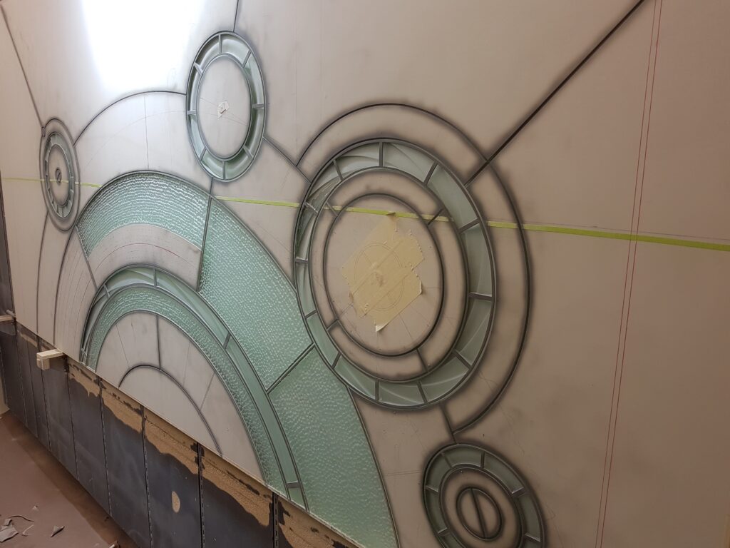 After a couple of weeks of carving and firing, the first attempt cracked before it even made it to tempering. Dang! And then so did the second. UGH! Although we’d had success with this process many times before, it seemed that this one had reached some sort of limit regarding tensions created in the glass surface while trying to etch the background specific to a panel of this size… so, it was literally back to the drawing board…