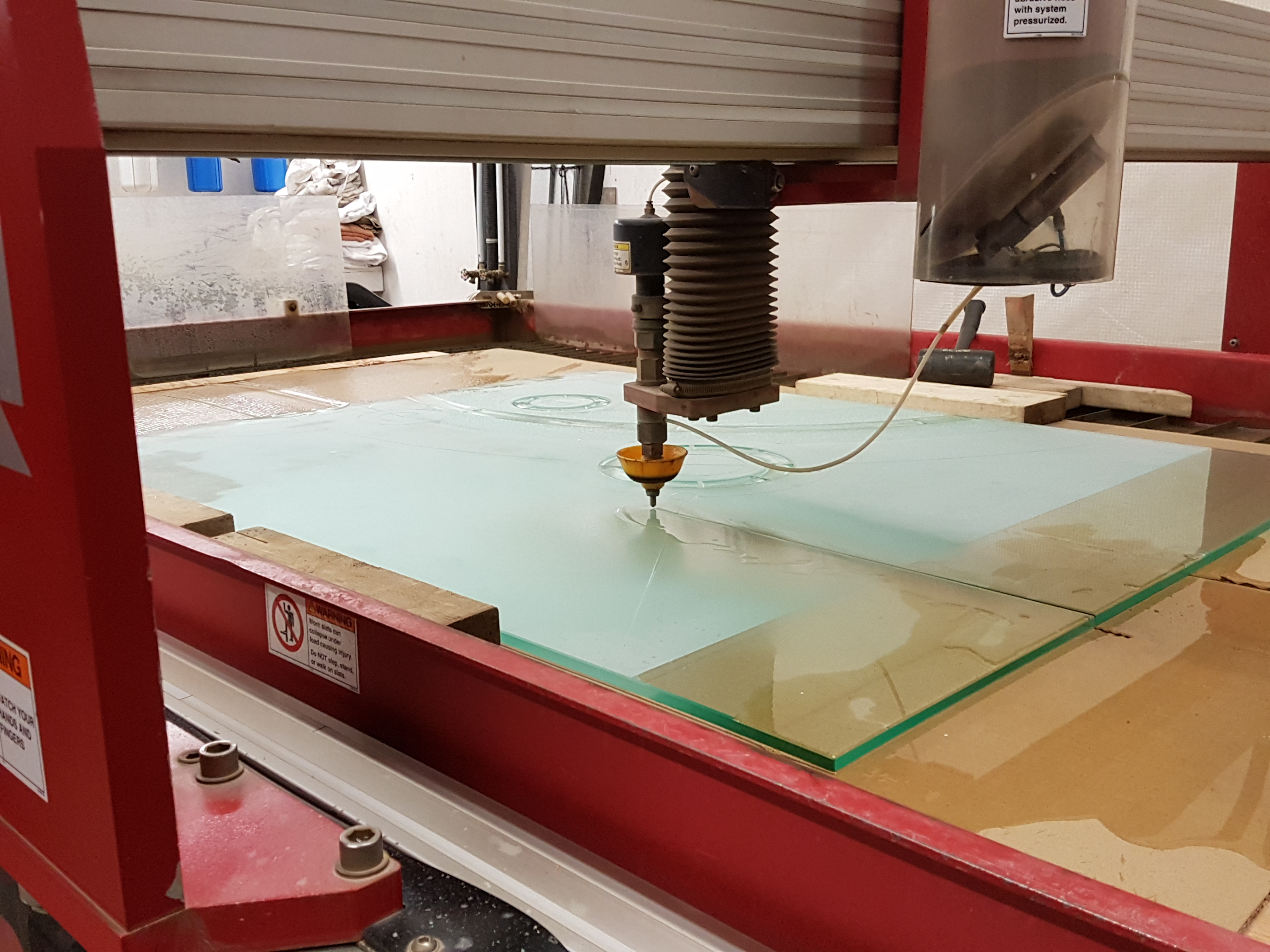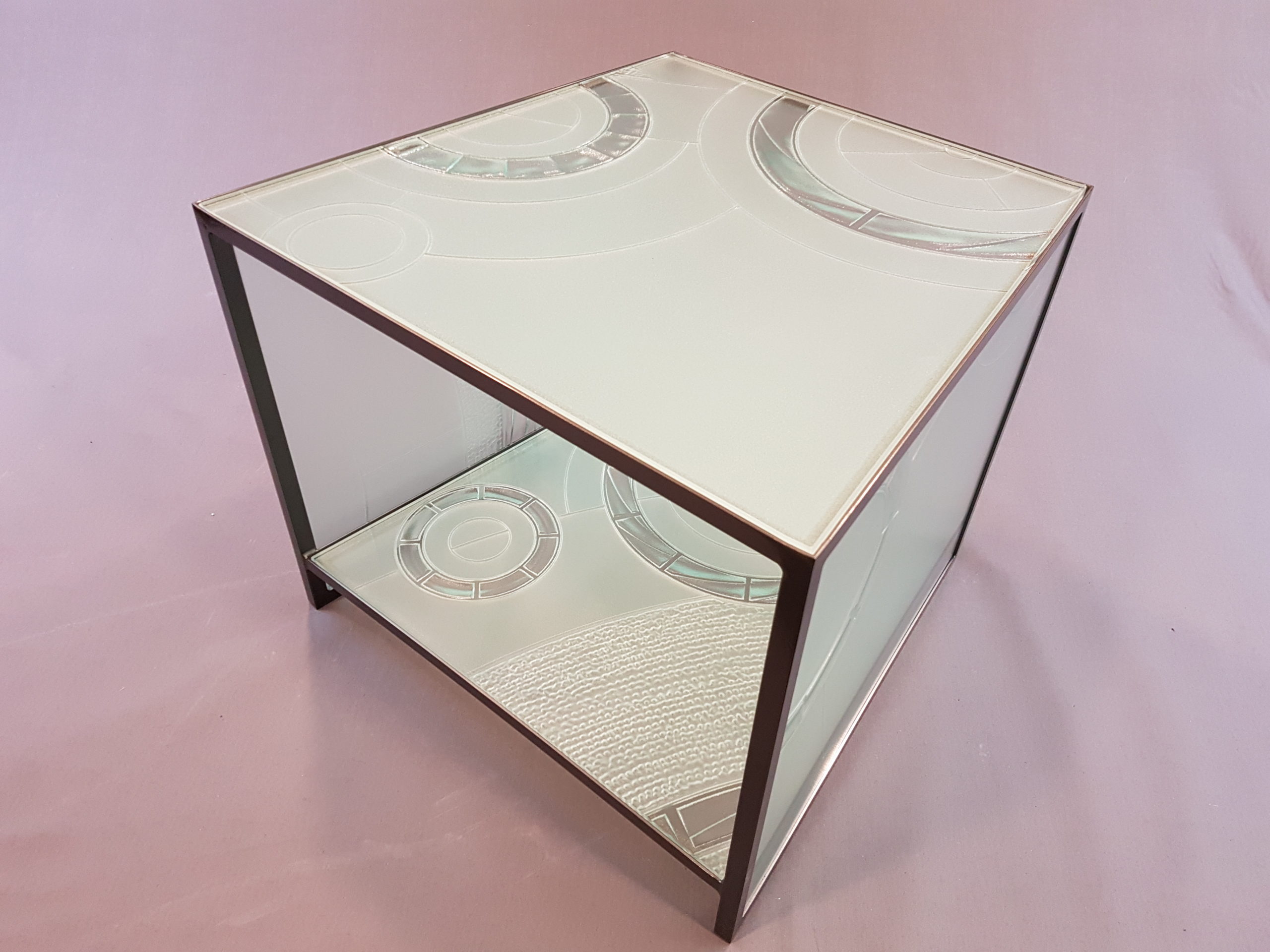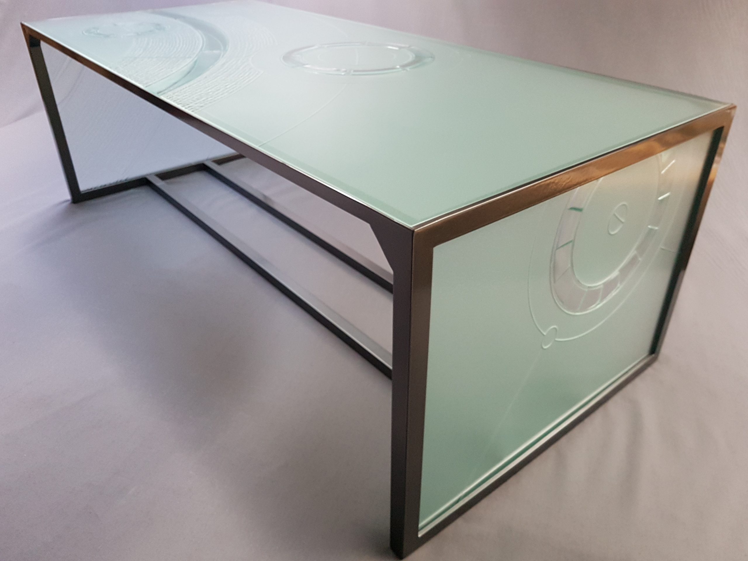 After a couple of weeks of carving and firing, the first attempt cracked before it even made it to tempering. Dang! And then so did the second. UGH! Although we’d had success with this process many times before, it seemed that this one had reached some sort of limit regarding tensions created in the glass surface while trying to etch the background specific to a panel of this size… so, it was literally back to the drawing board…