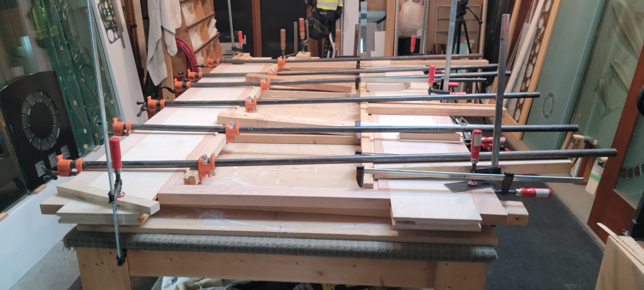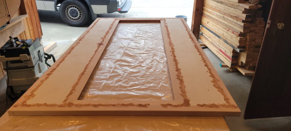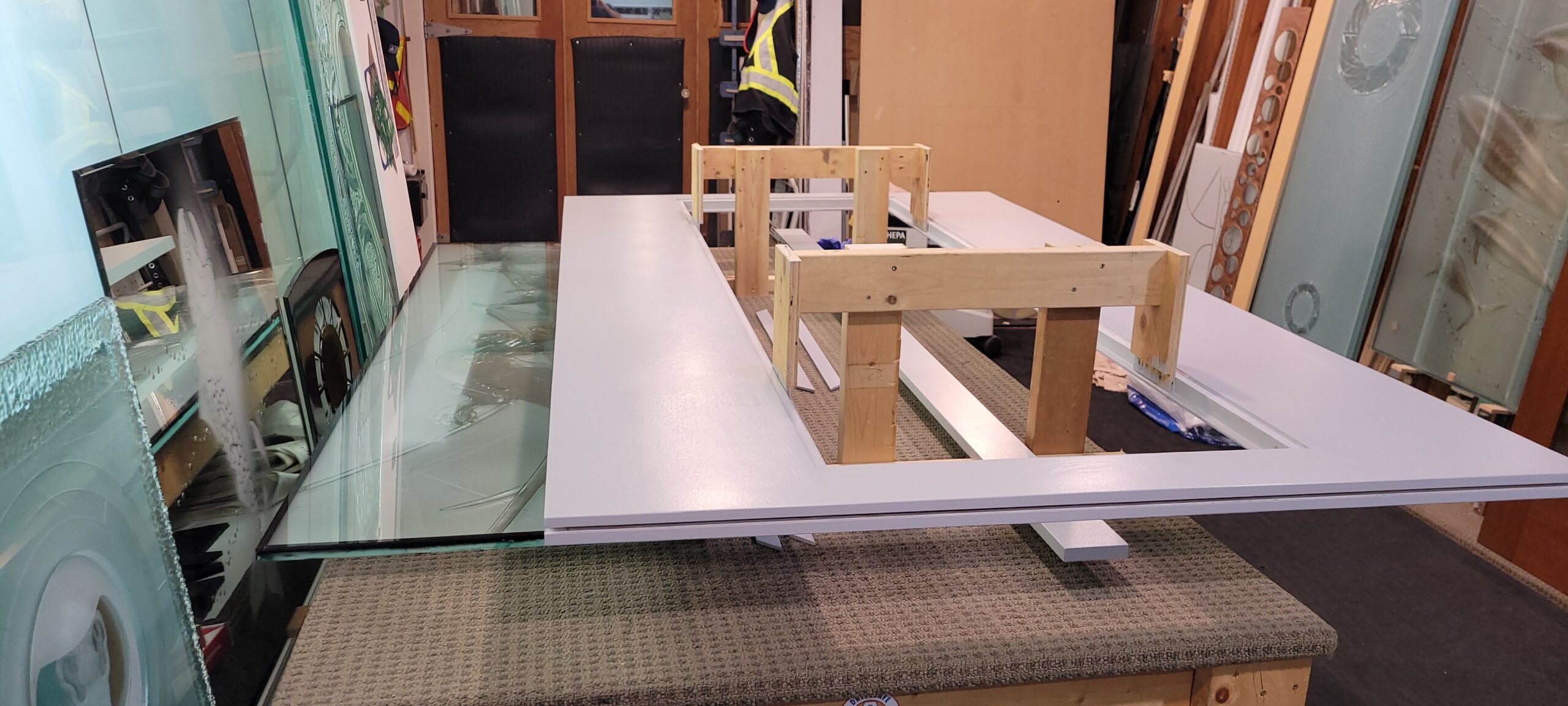 Lamination glue layupFrame and glass stop completedTransport/Exhibition Crate showing completed frame ‘dry-fit’ into opening.Ready to close up and ship off…