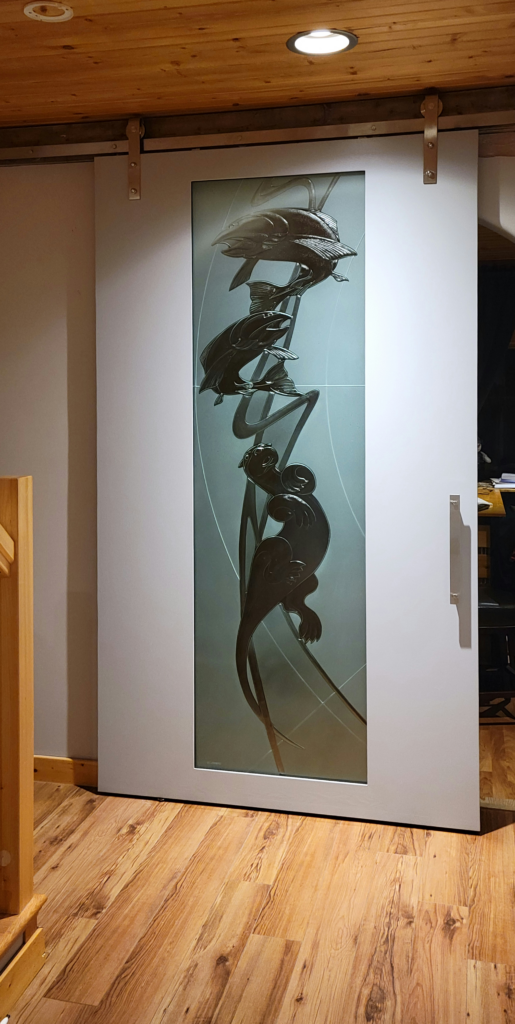 Shop test of light mechanismClient / Artist stops in to see the progress…Of equal importance was designing a transport carriage to protect the soft cedar and hand-carved glass. (artwork pattern and canoe carving done by client)Mounted securely to pallet/crate base, the piece can head off to Europe.Threaded nut-inserts and pan head bolts makes the crate re-usable.